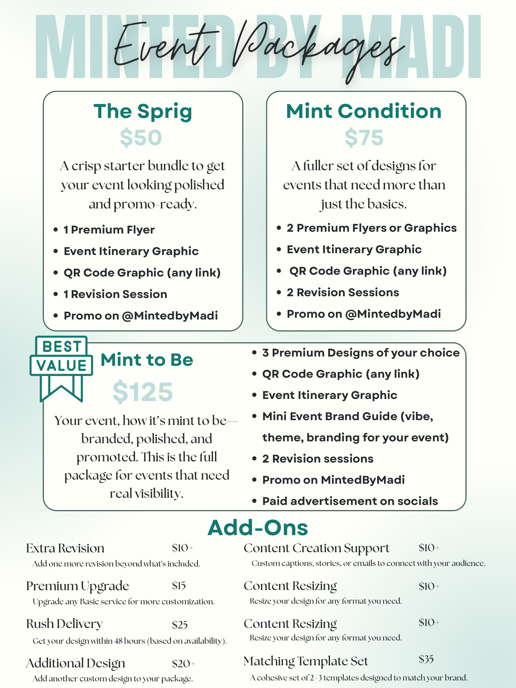 At Minted by Madi, we bring creativity, connection, and clarity to every part of your journey—whether you’re planning an unforgettable event, building your brand, or growing your small business. Our services include:
